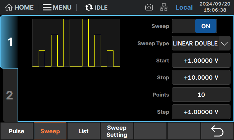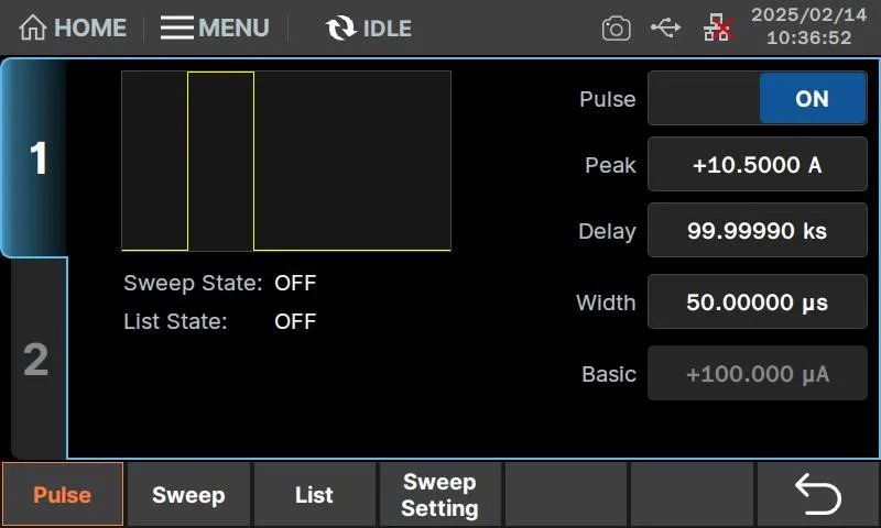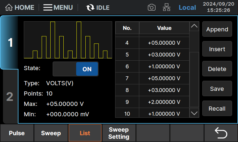 列表模式支持用戶自定義輸出序列,最小間隔可達10μs,參數(shù)變化可以是線性的,也可以是非線性的,甚至是任意值或自定義順序。SMM3000X按照列表中設(shè)定的值依次輸出電壓或電流,同時測量并記錄數(shù)據(jù),適用于不規(guī)則的電壓/電流變化測試或多段測試等。