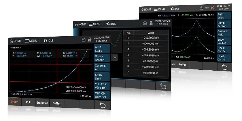 SMM3000X系列提供了Graph、Roll和Measure結(jié)果視圖等多種視圖模式。用戶可以通過Graph視圖對數(shù)學(xué)運算結(jié)果進行實時曲線繪制,通過Roll視圖對測試數(shù)據(jù)的時域波形進行顯示,通過Measure視圖獲得跡線統(tǒng)計結(jié)果。多種視圖模式提供了多維度的參數(shù)分析,用戶可更直觀地理解和分析測試數(shù)據(jù)。