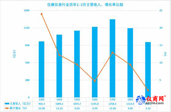 2.1儀器儀表行業(yè)歷年1-2月主營收入、增長率比較