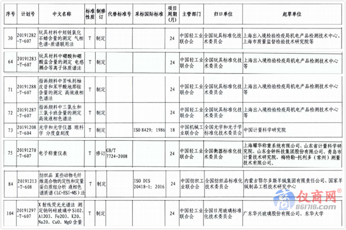 本專項計劃共105項,其中制定49項,修訂56項;推薦標準項目103項,指導性技術(shù)文件2項。在105項標準計劃中,涉及了氣相色譜-質(zhì)譜聯(lián)用、電感耦合等離子體質(zhì)譜法、離子色譜法、高效液相色譜法等多項儀器分析方法標準。