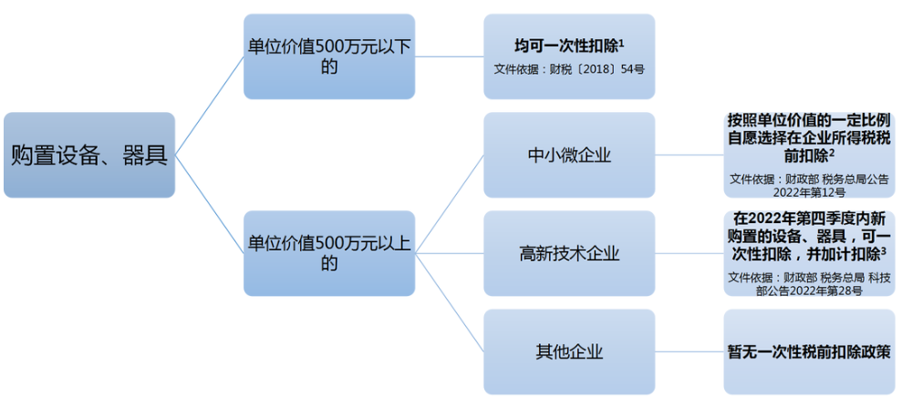 首先,對(duì)于單位價(jià)值不超過500萬元的設(shè)備、器具,企業(yè)可以一次性計(jì)入當(dāng)期成本費(fèi)用,在計(jì)算應(yīng)納稅所得額時(shí)進(jìn)行扣除,即刻享受減稅優(yōu)惠。而對(duì)于單位價(jià)值超過500萬元的大型設(shè)備、器具,仍需按照現(xiàn)行企業(yè)所得稅法進(jìn)行折舊。