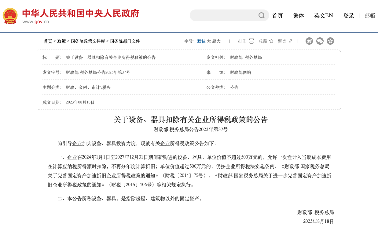 財(cái)政部 稅務(wù)總局關(guān)于設(shè)備、器具扣除有關(guān)企業(yè)所得稅政策的公告