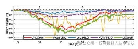 本文的方法在多種高動(dòng)態(tài)運(yùn)動(dòng)環(huán)境下(采用快步運(yùn)動(dòng)方式)進(jìn)行了廣泛的測(cè)試,結(jié)果表明,與其他先進(jìn)的LiDAR方法相比,Leg-KILO更適合動(dòng)態(tài)四足機(jī)器人的運(yùn)動(dòng)場(chǎng)景。以機(jī)器人為中心的局部地圖維護(hù)對(duì)接觸高度檢測(cè)的精度有重要影響。未來(lái),我們將更加關(guān)注地圖一致性的改進(jìn),以進(jìn)一步提升接觸高度檢測(cè)和點(diǎn)云配準(zhǔn)的精度。