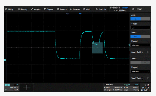 特殊的信號(hào)使用傳統(tǒng)的觸發(fā)類型可能需要進(jìn)行接近20步的設(shè)置步驟,為此,SDS5000X在所有觸發(fā)類型上面都增加了區(qū)域觸發(fā)功能。通過(guò)簡(jiǎn)單的畫(huà)定觸發(fā)區(qū)域框即可對(duì)復(fù)雜信號(hào)進(jìn)行‘’一步觸發(fā)‘’。
