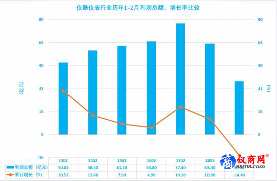 2.2儀器儀表行業(yè)歷年1-2月利潤總額、增長率比較