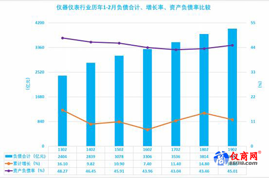 2.10儀器儀表行業(yè)歷年1-2月負(fù)債合計(jì)、增長率、資產(chǎn)負(fù)債率比較