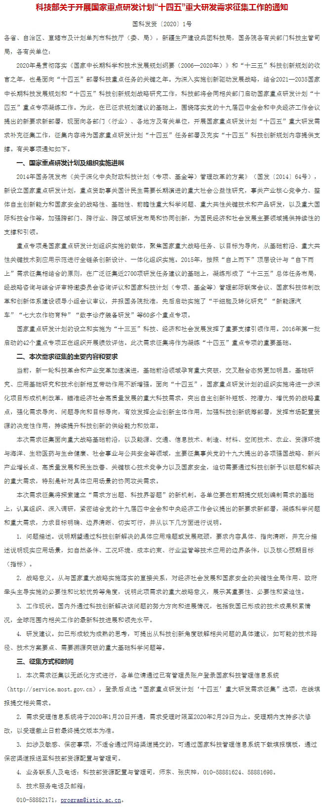 【儀商網(wǎng)-儀器儀表熱點(diǎn)】2020年1月6日,國(guó)家科技部網(wǎng)站發(fā)布了關(guān)于開(kāi)展國(guó)家重點(diǎn)計(jì)劃“十四五”重大研發(fā)需求征集通知。我們儀器儀表行業(yè)的科研人員需要密切了解國(guó)家發(fā)展需求、科研趨勢(shì),規(guī)劃自己的研發(fā)方向,甚至可以把自己目前的研發(fā)向國(guó)家申報(bào)重點(diǎn)專項(xiàng)。