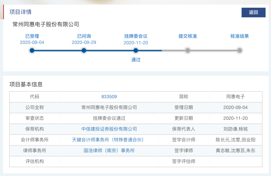 從申報進程來看,同惠電子精選層申報于9月4日獲受理,9月29日獲股轉公司問詢,至通過精選層審議會,歷時僅77天。