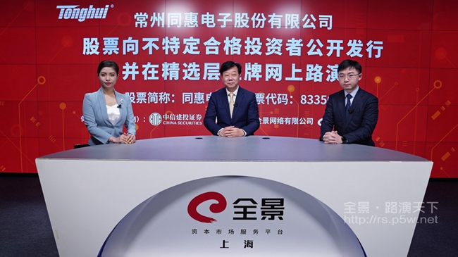 同惠電子股票向不特定合格投資者公開發(fā)行并在精選層掛牌網(wǎng)上路演12月23日下午在全景網(wǎng)舉辦,同惠電子董事長(zhǎng)、總經(jīng)理趙浩華;同惠電子董事、董事會(huì)秘書王恒斌;同惠電子董事、 財(cái)務(wù)總監(jiān)唐玥;中信建投投行委成長(zhǎng)企業(yè)部 副總裁 保薦代表人楊銘;中信建投投行委成長(zhǎng)企業(yè)部 副總裁、保薦代表人王潤(rùn)達(dá)作為路演嘉賓參與本次活動(dòng),并在線回答投資者提問。