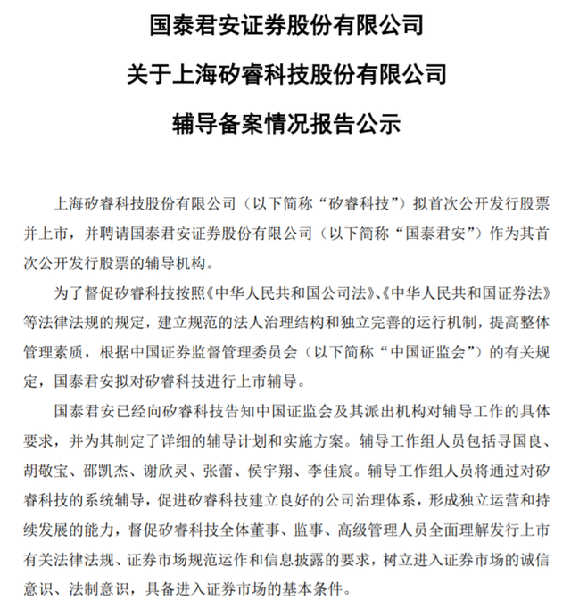 7月27日,國泰君安證券發(fā)布關(guān)于上海矽??萍脊煞萦邢薰据o導(dǎo)備案情況報告公示。