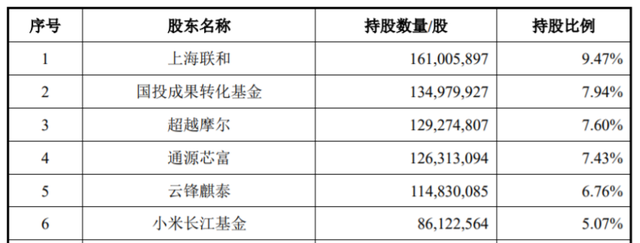 截至本公示出具日,上海聯(lián)和及其控制的信息投資和新微技術(shù)合計持股比例為11.366%;公司員工持股平臺合計持股比例為8.96%;國投創(chuàng)投持股比例為7.94%;超越摩爾持股比例為7.604%;通源芯富持股比例為7.43%;由上海上創(chuàng)新微投資管理有限公司擔(dān)任普通合伙人的上創(chuàng)科微二期、上海迎翱芯和物聯(lián)網(wǎng)三期合計持股比例為5.71%;云鋒麒泰持股比例為6.755%;小米長江持股比例為5.066%;其余股東持股比例均低于5%。