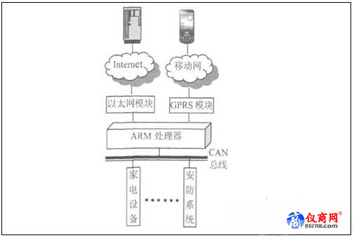 如圖l所示,從網(wǎng)絡(luò)結(jié)構(gòu)上看,系統(tǒng)主要由三層網(wǎng)絡(luò)組成,最底層網(wǎng)絡(luò)使用CAN現(xiàn)場(chǎng)總線將住戶所有用電設(shè)備連接到各住戶的智能分站上;各智能分站通過以太網(wǎng)模塊或GPRS模塊連接到物聯(lián)網(wǎng)或移動(dòng)網(wǎng)。用戶通過電腦或手機(jī)訪問和操控自己家里的用電設(shè)備,如空調(diào)的開關(guān)、溫度的調(diào)節(jié),實(shí)時(shí)調(diào)閱水電氣表的讀數(shù),查看冰箱里食物的儲(chǔ)存情況等.為確保安全和效能,小區(qū)通信系統(tǒng)采用有線和無線