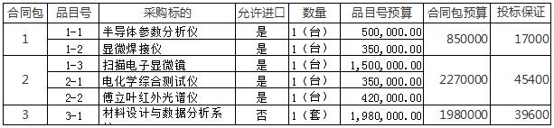 現(xiàn)需采購(gòu):半導(dǎo)體參數(shù)分析儀 、顯微焊接儀、掃描電子顯微鏡、電化學(xué)綜合測(cè)試儀、傅立葉紅外光譜儀、材料設(shè)計(jì)與數(shù)據(jù)分析系統(tǒng)。
