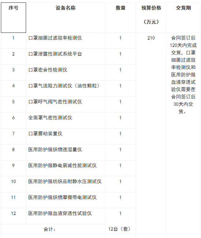 近日,中國政府采購網發(fā)布《廣東省質量監(jiān)督輕紡產品檢驗站碳纖維及其復合材料產品能力提升項目(新型冠狀病毒感染肺炎疫情防控產品檢測能力)競爭性談判公告》,公告顯示,廣東產品質量監(jiān)督檢驗研究院采購一批口罩細菌過濾效率檢測儀、口罩泄露性測試系統(tǒng)平臺、口罩密合性檢測儀、口罩氣流阻力測試儀(油性顆粒)、全面罩氣密性測試儀、口罩震動裝置儀、醫(yī)用防護服織物透濕量儀 、 醫(yī)用防護服靜電衰減性能測試儀、 醫(yī)用防護服紡織品耐靜水壓測試儀、醫(yī)用防護服織物摩擦帶電測試儀、醫(yī)用防護服血液穿透性試驗儀等儀器設備,共12臺,預算210萬!