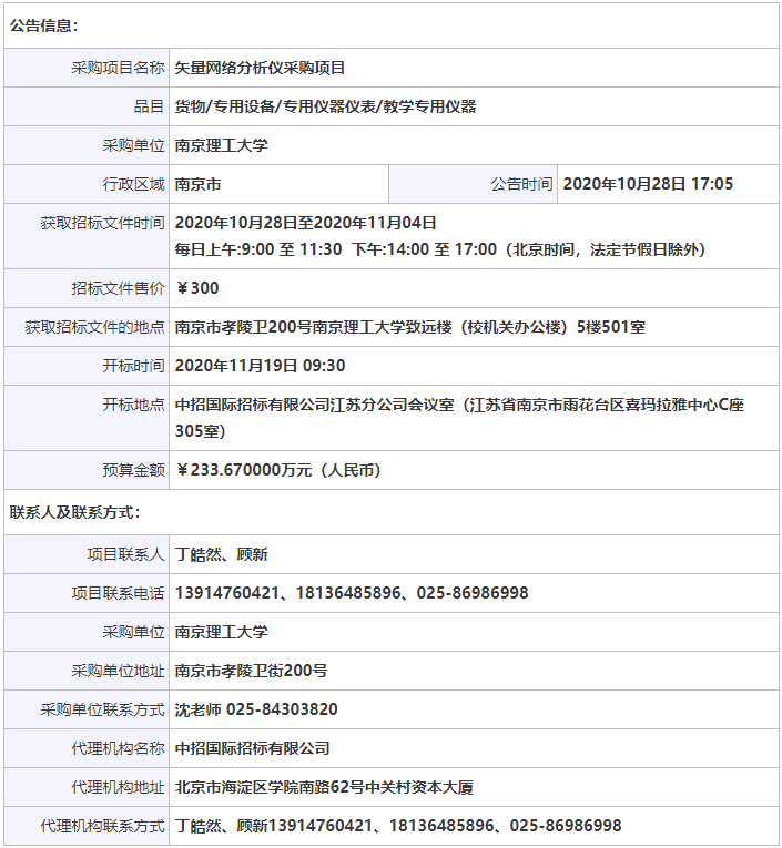 2020年10月28日,中國政府采購網(wǎng)發(fā)布《南京理工大學(xué)矢量網(wǎng)絡(luò)分析儀采購項目公開招標公告》。公告內(nèi)容顯示,南京理工大學(xué)采購1套矢量網(wǎng)絡(luò)分析儀,主要用于W波段及V波段微波射頻系統(tǒng)的科學(xué)研究以及研究生教學(xué),預(yù)算金額為233.67萬。