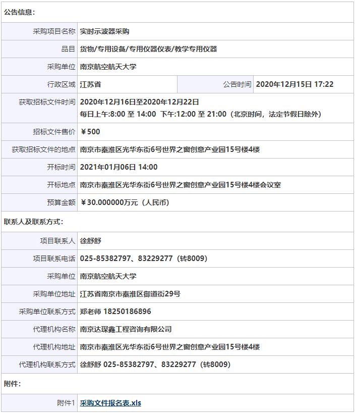 2020年12月15日 ,中國政府采購網(wǎng)發(fā)布《南京航空航天大學(xué)實(shí)時(shí)示波器采購公開招標(biāo)公告》,公告內(nèi)容顯示,南京航空航天大學(xué)擬采購1套實(shí)時(shí)示波器,預(yù)算金額30萬。