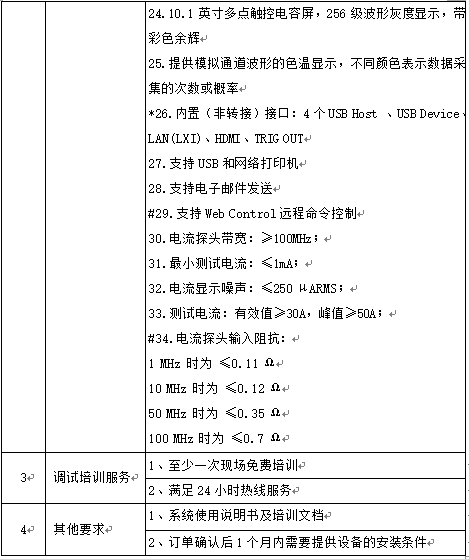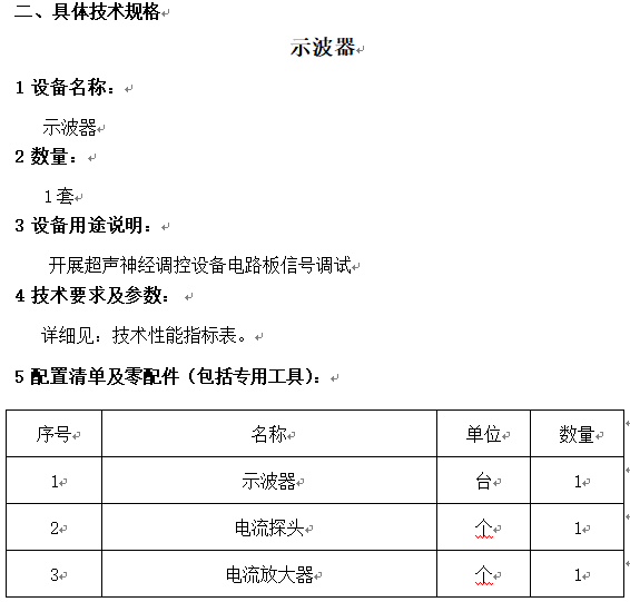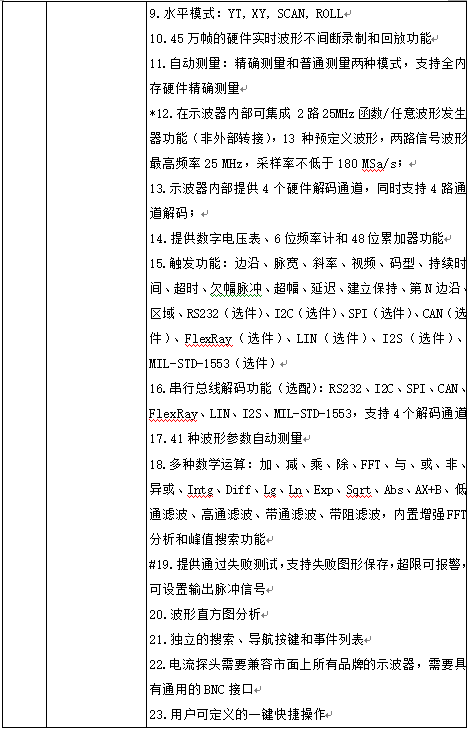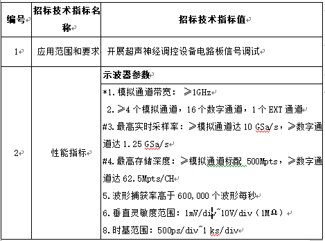 根據(jù)附件的《技術(shù)性能指標(biāo)表》,應(yīng)用范圍和要求是“開(kāi)展超聲神經(jīng)調(diào)控設(shè)備電路板信號(hào)調(diào)試”,性能指標(biāo)要求包括:模擬通道帶寬≥1GHz,≥4個(gè)模擬通道,16個(gè)數(shù)字通道,1個(gè)EXT通道;最高實(shí)時(shí)采樣率≥模擬通道達(dá)10 GSa/s,≥數(shù)字通道達(dá)1.25 GSa/s;最高存儲(chǔ)深度≥模擬通道標(biāo)配500Mpts,≥數(shù)字通道達(dá)62.5Mpts/CH;波形捕獲率高于600000個(gè)波形每秒,等等。