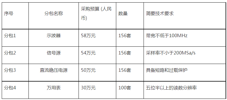 項目名稱與概況:電子實驗室電子測量儀器。采購方式:競爭性磋商。采購需求分為4個分包:1)156套示波器(帶寬不低于100MHz);2)156套信號源(采樣率不小于200MSa/s);3)156套直流穩(wěn)壓電源(具備短路和過載保護);4)100套萬用表(五位半以上的讀數(shù)分辨率)。