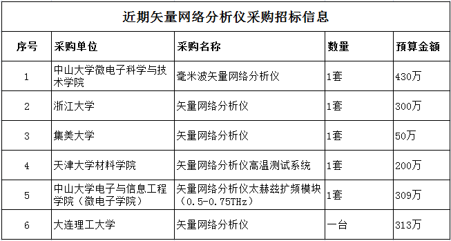 其中,中山大學微電子科學與技術(shù)學院擬采購1套毫米波矢量網(wǎng)絡(luò)分析儀,預(yù)算金額430 萬元;浙江大學也發(fā)布了采購矢量網(wǎng)絡(luò)分析儀的招標公告,擬采購1套矢量網(wǎng)絡(luò)分析儀,預(yù)算金額300萬元;集美大學擬采購矢量網(wǎng)絡(luò)分析儀1套,預(yù)算金額50萬元;天津大學材料學院擬采購矢量網(wǎng)絡(luò)分析儀高溫測試系統(tǒng)1套,預(yù)算金額200萬元;中山大學電子與信息工程學院(微電子學院)采購矢量網(wǎng)絡(luò)分析儀太赫茲擴頻模塊(0.5-0.75THz),預(yù)算金額309萬元。此外,大連理工大學擬采購超高溫介電性能測試系統(tǒng)主體設(shè)備——矢量網(wǎng)絡(luò)分析儀一臺,為測量材料的寬頻(最高至110GHz)介電性能和磁性能等,為我校透波、吸波材料的研制提供設(shè)備支持。預(yù)算金額313萬元。