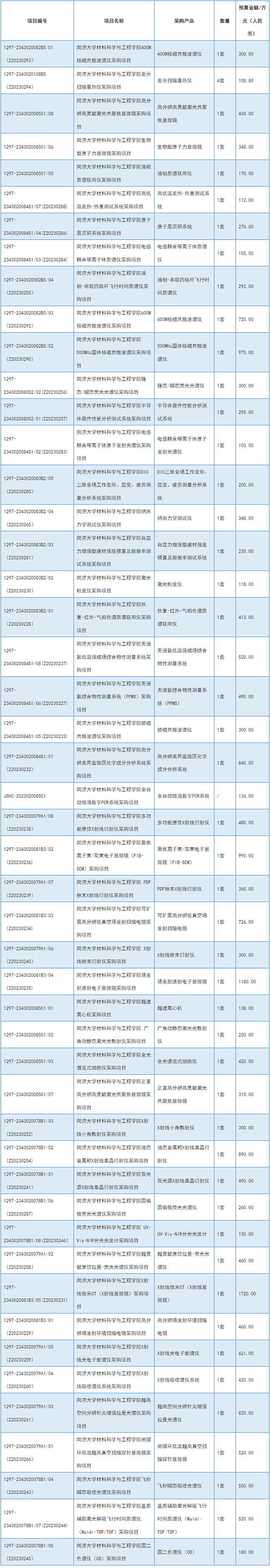 近日,同濟(jì)大學(xué)材料科學(xué)與工程學(xué)院接連發(fā)布49項(xiàng)招標(biāo)公告,采購(gòu)液相質(zhì)譜聯(lián)用儀、生物型原子力顯微鏡等儀器共52套,預(yù)算總計(jì)21668.8萬(wàn)元。