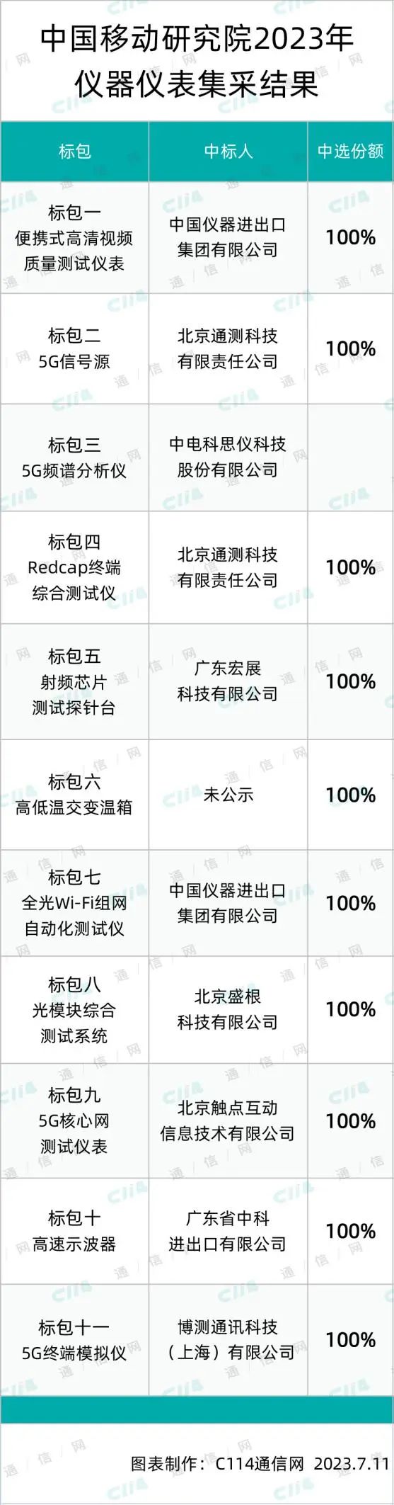 7月11日消息(顏翊)從中國(guó)移動(dòng)官網(wǎng)獲悉,中國(guó)移動(dòng)研究院日前公示了2023年儀器儀表采購(gòu)項(xiàng)目10個(gè)標(biāo)包的采購(gòu)結(jié)果,中國(guó)儀器、北京通測(cè)、中電科思儀等10家中標(biāo)。