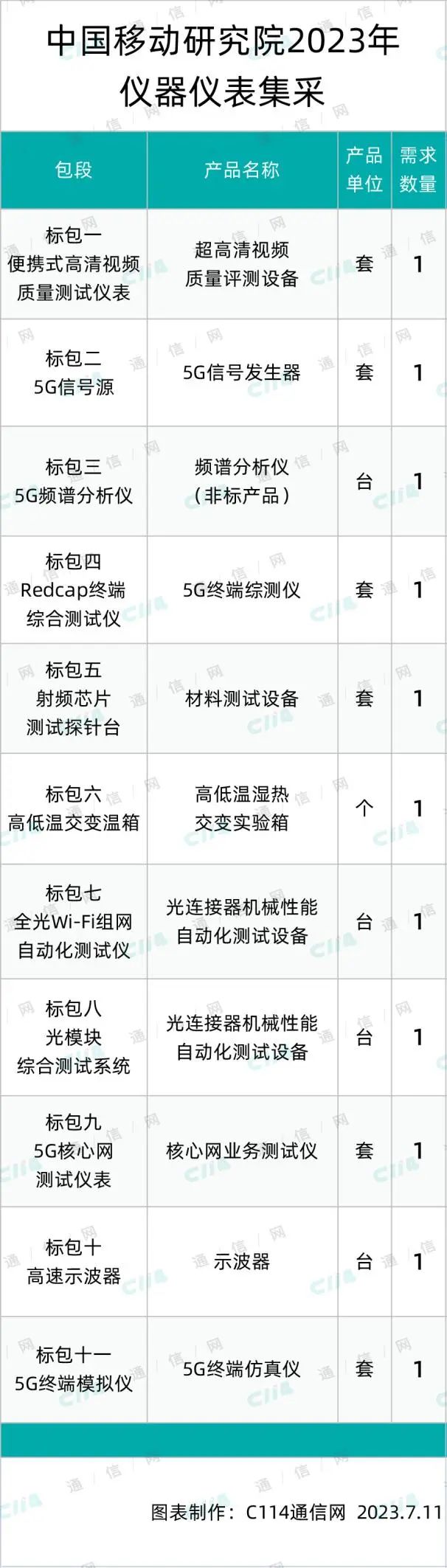 據(jù)此前中國(guó)移動(dòng)研究院發(fā)布的采購(gòu)公告顯示,本次采購(gòu)的產(chǎn)品主要包括:便攜式高清視頻質(zhì)量測(cè)試儀表1套、5G信號(hào)源1套、5G頻譜分析儀1套、Redcap終端綜合測(cè)試儀1套;射頻芯片測(cè)試探針臺(tái)1套、高低溫交變溫箱1套;全光Wi-Fi組網(wǎng)自動(dòng)化測(cè)試儀1套、光模塊綜合測(cè)試系統(tǒng)1套;5G核心網(wǎng)測(cè)試儀表1套;5G終端模擬儀1套;高速示波器1套。項(xiàng)目共劃分成11個(gè)標(biāo)包,每個(gè)標(biāo)包的中標(biāo)人為1名。