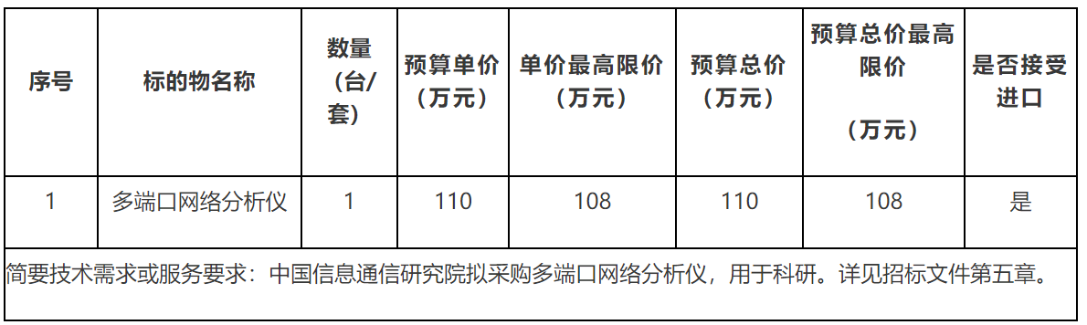 其中,《中國(guó)信息通信研究院2024年光網(wǎng)絡(luò)新技術(shù)驗(yàn)證項(xiàng)目-多端口網(wǎng)絡(luò)分析儀公開(kāi)招標(biāo)公告》內(nèi)容顯示,中國(guó)信息通信研究院擬采購(gòu)1臺(tái)多端口網(wǎng)絡(luò)分析儀用于科研,預(yù)算金額110萬(wàn)元。