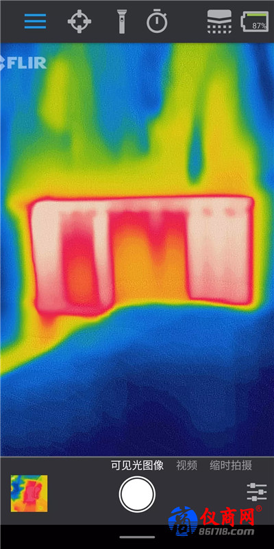 在熱成像界面的上方有四個(gè)功能圖標(biāo),從左至右分別是菜單、測(cè)量點(diǎn)選擇、手機(jī)閃關(guān)燈開(kāi)關(guān)、以及延時(shí)拍照。這其中最有用的還是這個(gè)測(cè)量點(diǎn)選擇功能,有了它你便可以輕松查看所拍攝物體的表面溫度,想查看哪兒就查看哪兒,非常方便。