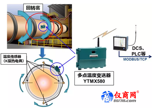 無線溫度變送器YTMX580安裝于回轉(zhuǎn)窯側(cè)面,K型熱電偶的信號通過無線溫度變送器,發(fā)送ISA100無線信號給無線網(wǎng)關(guān)GX20W。無線網(wǎng)關(guān)GX20W現(xiàn)場監(jiān)視并記錄各個通道的熱電偶信號的變化。另外,無線網(wǎng)關(guān)GX20W接收的無線信號還可以通過Modbus TCP傳送給其他上位系統(tǒng),如DCS、PLC等。應(yīng)用行業(yè)包括:煅燒廠、 水泥廠、垃圾焚燒廠、制藥、食品加工、化工等。