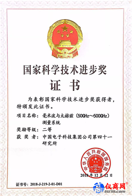 2019年1月8日上午,中共中央、國務(wù)院在北京隆重舉行國家科學(xué)技術(shù)獎(jiǎng)勵(lì)大會(huì)。由中電儀器研制的“毫米波與太赫茲(50GHz-500GHz)測(cè)量系統(tǒng)”項(xiàng)目獲得國家科技進(jìn)步二等獎(jiǎng)。
