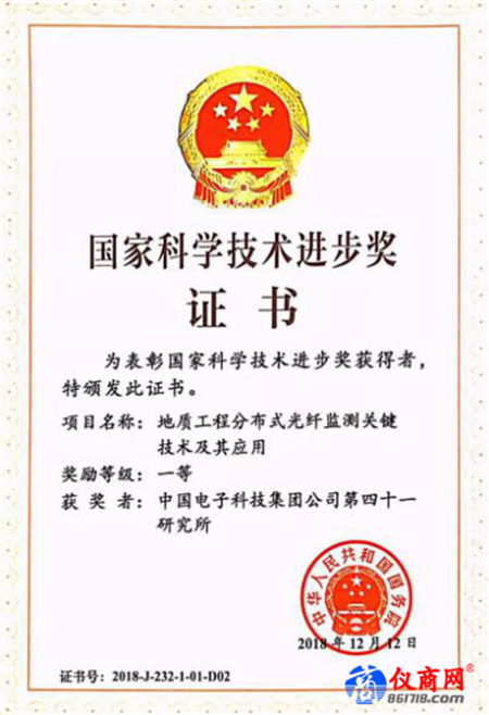 在2018年度國家科學(xué)技術(shù)獎(jiǎng)勵(lì)大會(huì)上,中電儀器參與研究的“地質(zhì)工程分布式光纖監(jiān)測(cè)關(guān)鍵技術(shù)及其應(yīng)用”項(xiàng)目獲得國家科學(xué)技術(shù)進(jìn)步獎(jiǎng)一等獎(jiǎng)。