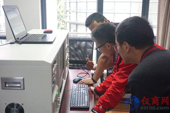 優(yōu)利德產(chǎn)品經(jīng)理金戰(zhàn)華與軟件開發(fā)經(jīng)理楊智忠現(xiàn)場和倪主任交流實驗綜合測試平臺系統(tǒng),倪主任針對系統(tǒng)提出自己的想法并展開討論
