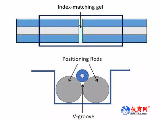 另外一種機(jī)械接續(xù)方法則是V型槽。這需要使用某種基材或者定位桿來(lái)形成V型槽,讓兩根光纖能夠?qū)R。如果選擇基材,需要使用粘合劑將光纖固定在溝槽基材上。如果使用定位桿V型槽,需要將兩根定位桿并排放在一起形成一個(gè)V型的溝槽,然后或者使用彈簧,或者使用第三根定位桿,將光纖壓入槽中。