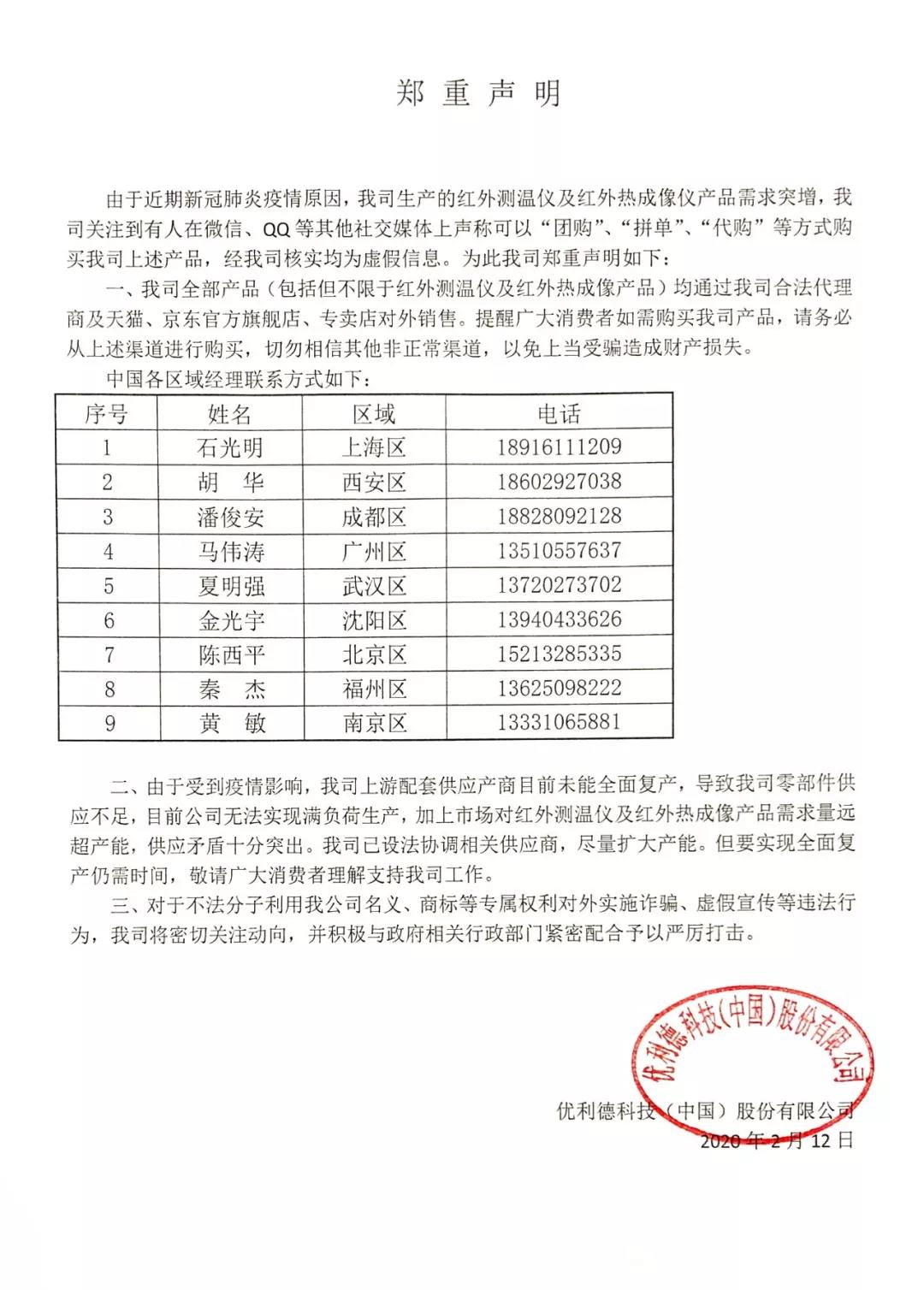 由于近期新冠肺炎疫情原因,優(yōu)利德生產(chǎn)的紅外測溫儀及紅外熱成像儀產(chǎn)品需求突增,優(yōu)利德關(guān)注到有人在微信、QQ等其他社交媒體上聲稱可以“團(tuán)購”、“拼單”、“代購”等方式購買我司上述產(chǎn)品,經(jīng)優(yōu)利德核實(shí)均為虛假信息。為此優(yōu)利德鄭重聲明如下: