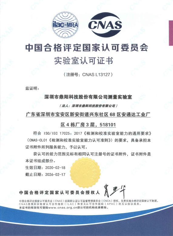 2020年2月,深圳市鼎陽(yáng)科技股份有限公司測(cè)量實(shí)驗(yàn)室經(jīng)中國(guó)合格評(píng)定國(guó)家認(rèn)可委員會(huì)(CNAS)批準(zhǔn),被授予CNAS認(rèn)可資格,這正式表明鼎陽(yáng)科技測(cè)量實(shí)驗(yàn)室具備了按相應(yīng)認(rèn)可準(zhǔn)則開展檢測(cè)服務(wù)的管理能力和技術(shù)能力。