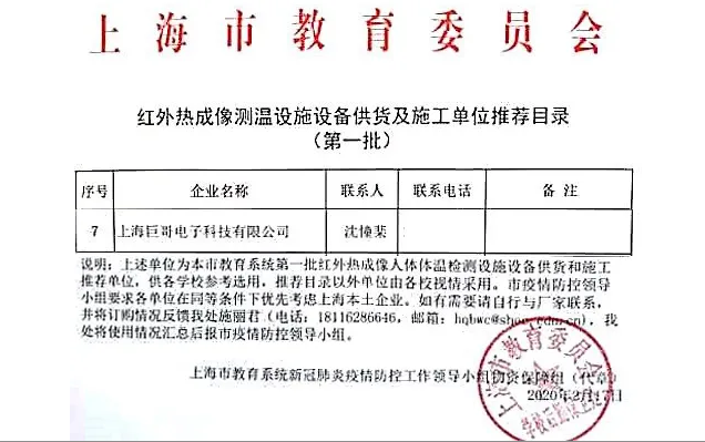 為確保上海市中小學(xué)和幼兒園順利開(kāi)學(xué),確保廣大師生健康安全,上海市教育系統(tǒng)疫情防控領(lǐng)導(dǎo)小組辦公室近日發(fā)布關(guān)于做好入校人員體溫檢測(cè)設(shè)備配置工作的通知,巨哥電子入選上海市教委第一批紅外熱成像測(cè)溫設(shè)備供貨單位推薦目錄。