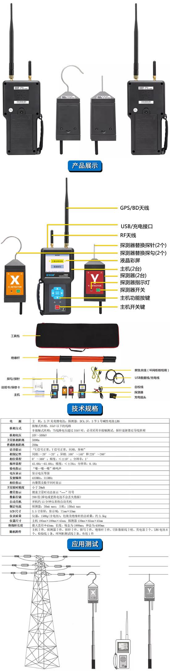 ETCR1500A遠(yuǎn)程高壓核相儀是同時(shí)具備超遠(yuǎn)距離核相和普通近距離核相功能,具有衛(wèi)星精準(zhǔn)授時(shí)功能,實(shí)現(xiàn)遠(yuǎn)距離核相、近距離普通、地下室核相、礦井下核相,授時(shí)精度小于20nS,可以同時(shí)接收六種衛(wèi)星授時(shí)系統(tǒng)的GNSS信號(hào),并且實(shí)現(xiàn)聯(lián)合授時(shí),確保核相精準(zhǔn)。本核相儀既可以高壓線路,還可以在高壓開關(guān)柜(中置柜、環(huán)網(wǎng)柜等)進(jìn)行核相,同時(shí)還具有測(cè)試相位、頻率、相序、變壓器組別判斷等功能,以及驗(yàn)電及電壓等級(jí)顯示功能。當(dāng)線路電壓超過35kV,必須使用非接觸核相,核相時(shí)將探測(cè)器的金屬探鉤逐漸靠近導(dǎo)線,當(dāng)感應(yīng)到電場(chǎng)信號(hào)即可完成核相,無需直接接觸高壓導(dǎo)線,安全快速。用于環(huán)網(wǎng)柜核相時(shí),探測(cè)器必須使用探針及環(huán)網(wǎng)柜測(cè)試線。測(cè)試儀由主機(jī)、X探測(cè)器,Y探測(cè)器、伸縮絕緣桿、監(jiān)測(cè)軟件、USB通訊線等組成,具有“X信號(hào)正常、Y信號(hào)正常、同相、異相”等語音提示功能,使測(cè)試更簡(jiǎn)單輕松。
