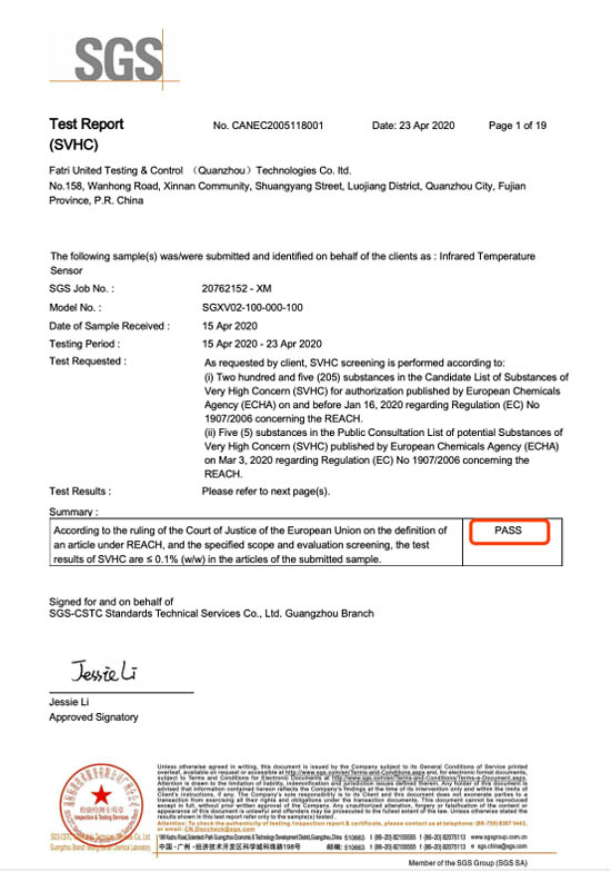 SGS出具的西人馬紅外測溫傳感器測試報告,報告顯示“pass(通過)”