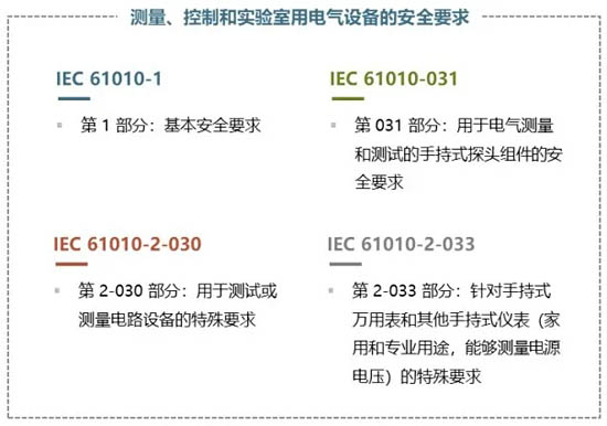 IEC 61010從防護等級、過電壓類別、污染、電氣間距和爬電距離等方面對測量、控制和實驗室用電氣設(shè)備進行了安全性規(guī)定。其中,對于測試附件安全來說,最重要的標準是IEC 61010-031。除了國際標準外,產(chǎn)品還需遵循當(dāng)?shù)胤ㄒ?guī)和指令,如歐盟指令2001/95/EC、歐盟指令2014/35/EC、美國NEC、加拿大CEC等。