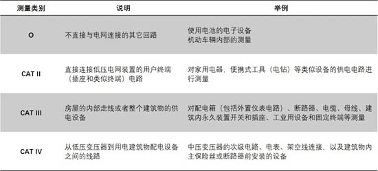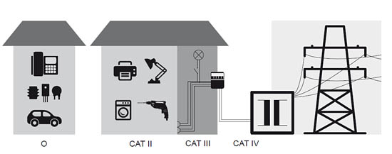 為了簡化每種應(yīng)用中使用的測試附件分類,IEC 61010-031標準制定4個測量類別,用于確定在電網(wǎng)中可進行測試的位置以及相應(yīng)要求。一般而言,CAT編號越高,對產(chǎn)品的安全要求越嚴格。操作人員需根據(jù)測量類別選擇對應(yīng)的測試附件。