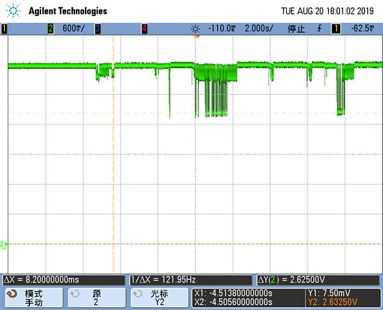 如圖2和圖3所示:從示波器測量的波形看,當(dāng)NB模組發(fā)射信號時(shí),耦合到脈沖信號線上的NB差模信號導(dǎo)致無磁計(jì)量脈沖輸出線上出現(xiàn)了異常脈沖,此異常脈沖反射到無磁計(jì)量傳感器的計(jì)量芯片上,從而干擾了正常的無磁計(jì)量工作,導(dǎo)致無磁計(jì)量模組采集的正常脈沖數(shù)據(jù)丟失,進(jìn)而導(dǎo)致NB無磁智能水表的機(jī)械讀數(shù)大于電子讀數(shù),電子模塊出現(xiàn)少計(jì)量的情況。