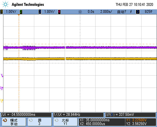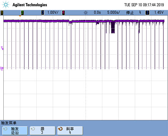通過桑銳電子發(fā)明的四芯雙絞屏蔽線和消震電容構(gòu)成的射頻差模信號吸收電路,能夠很好的把正負(fù)脈沖信號線上的感應(yīng)有害波形完美消除,解決在NB發(fā)射信號的干擾環(huán)境下無磁計(jì)量傳感器準(zhǔn)確計(jì)量的目的,從而保證NB智能無磁水表機(jī)電的一致性。增加射頻差模信號吸收電路后正脈沖線上的波形如圖4: