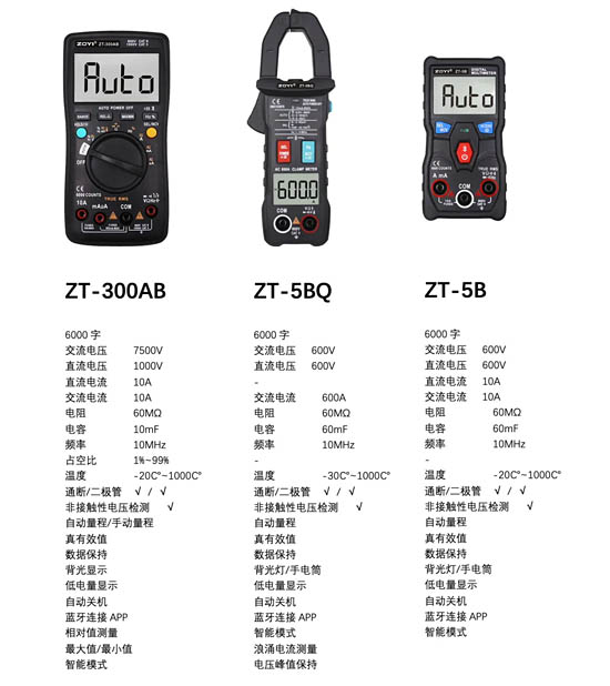 其中 ZT5B 和 ZT300AB 是藍(lán)牙萬(wàn)用表,ZT5BQ 是藍(lán)牙鉗形表。