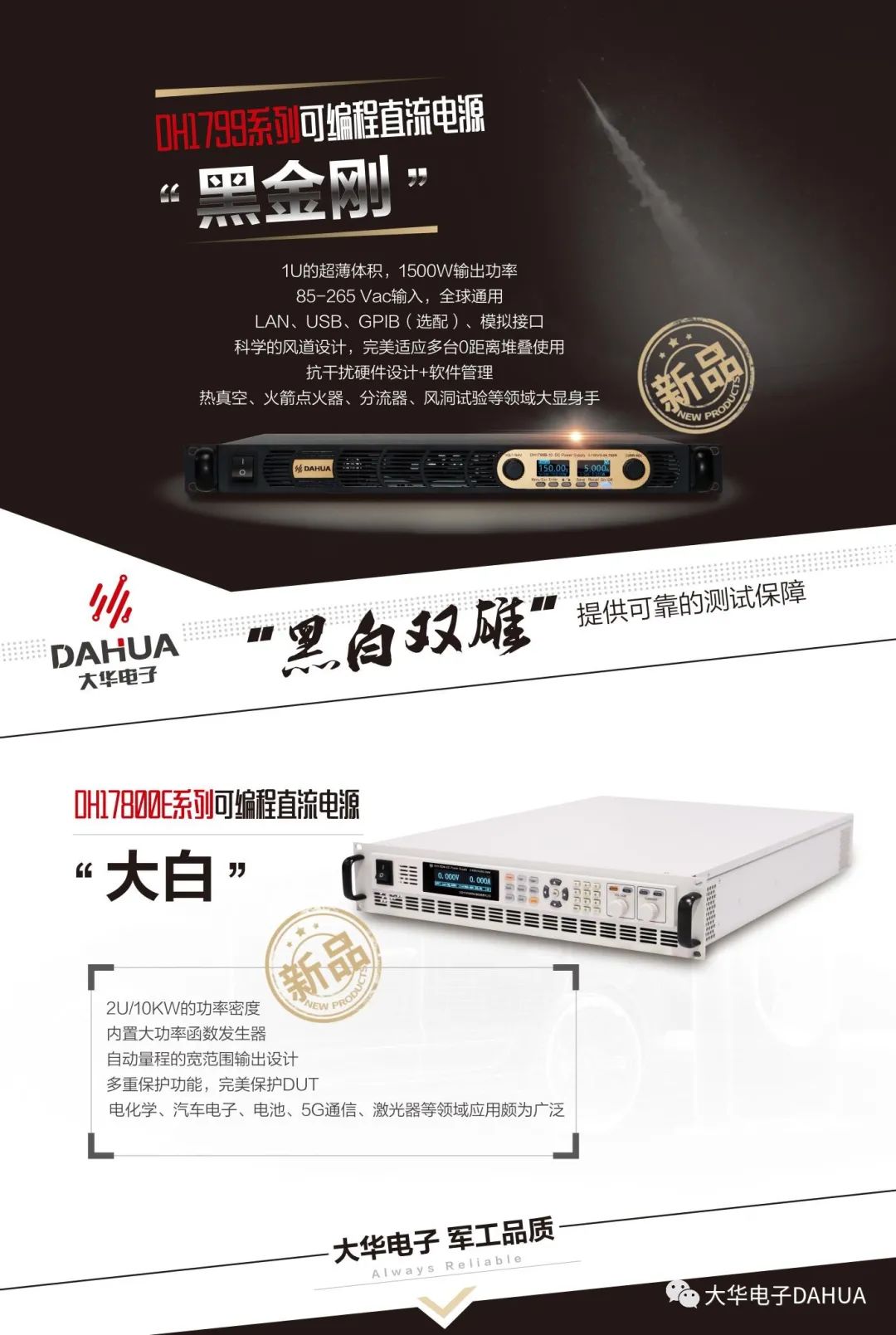 大華的DH1799系列可編程直流電源換裝升級(jí),采用時(shí)下最流行的黑金色彩搭配,給人一帥氣、可靠的感覺,并被冠以“黑金剛”的美稱,首發(fā)之初就以150臺(tái)的數(shù)量完美的為客戶配套熱真空測試系統(tǒng),收到客戶的高度認(rèn)可。