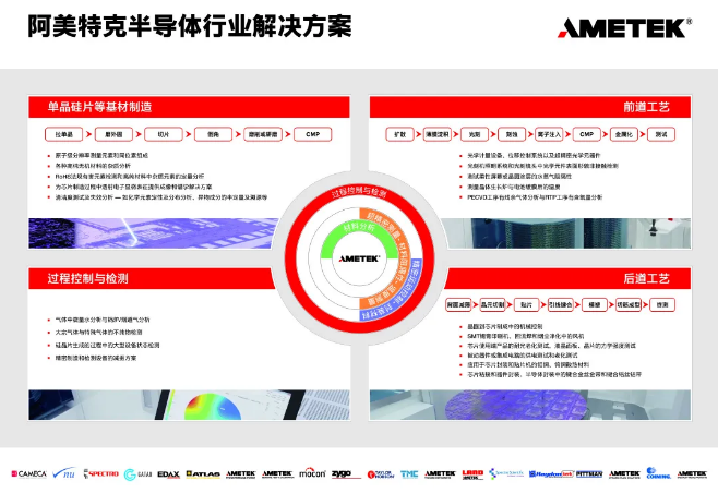 阿美特克——電子儀器和機(jī)電設(shè)備的全球領(lǐng)導(dǎo)者,深耕半導(dǎo)體行業(yè)多年,深入滲透半導(dǎo)體產(chǎn)業(yè)鏈,涵蓋過程控制與檢測,精密運(yùn)動(dòng)控制、封裝材料,超精密測量、材料阻隔性、溫度測量,材料分析,老化測試以及力學(xué)測試等不同應(yīng)用領(lǐng)域,覆蓋半導(dǎo)體單晶硅片等基材制造,前道工藝、過程控制與檢測以及后道工藝等。