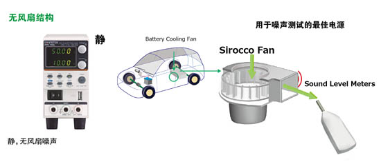 測量鼓風(fēng)機(jī)風(fēng)扇的噪聲時,如果供電的直流電源中有冷卻風(fēng)扇,則該聲音會影響測試結(jié)果。