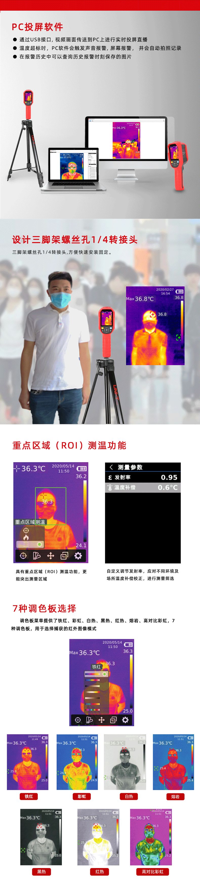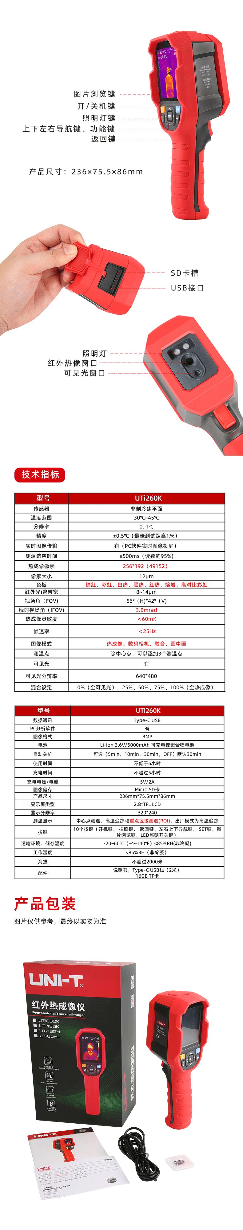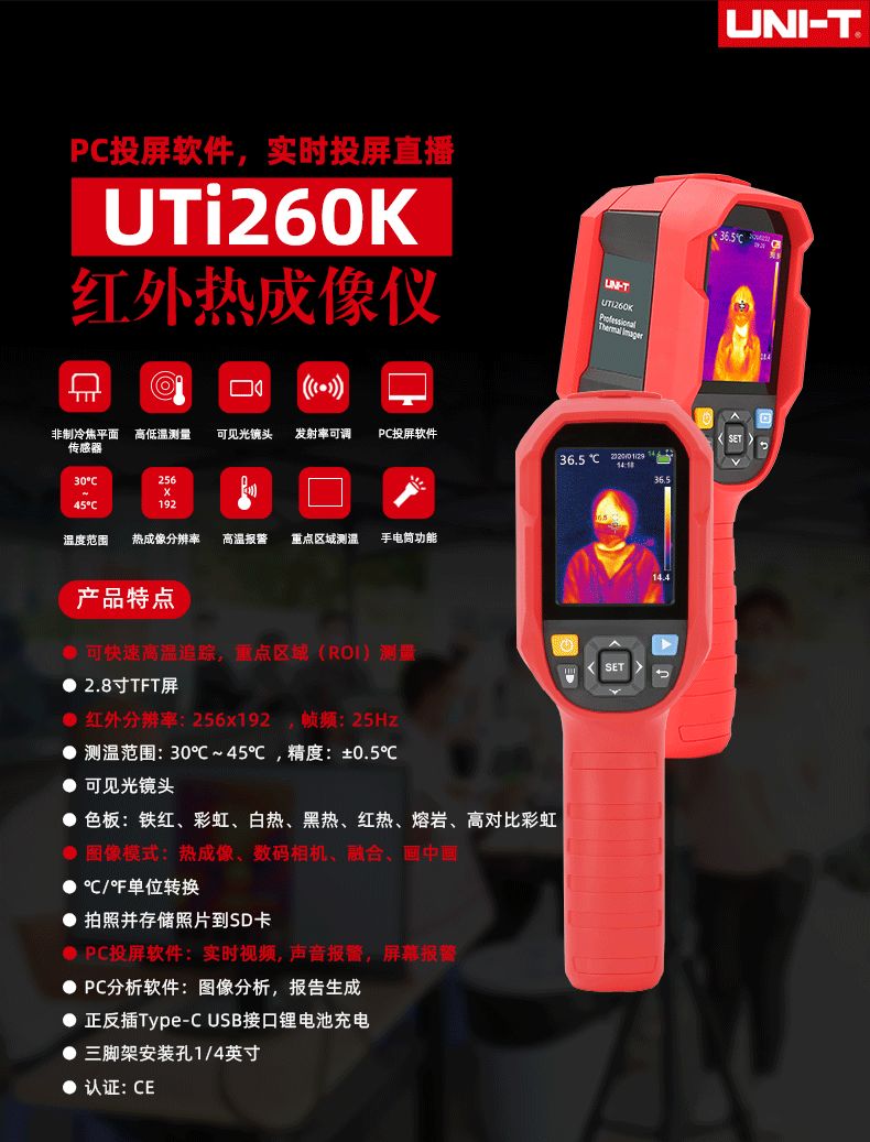 UTi260K是表面溫度測量和實時熱圖像相結合的紅外熱成像儀,通過熱成像儀清晰地顯示在屏幕上。機身設計美觀、功能齊全、堅固耐用。內置高亮度照明燈,采用新一代傳感器模組以保證優(yōu)秀的紅外分辨率和豐富的色板模式,能應對多種成像拍攝模式要求。拍照并存儲照片到SD卡.可通過PC軟件進行分析處理生成報告。并配備PC軟件實時投屏功能,進行快速篩查。