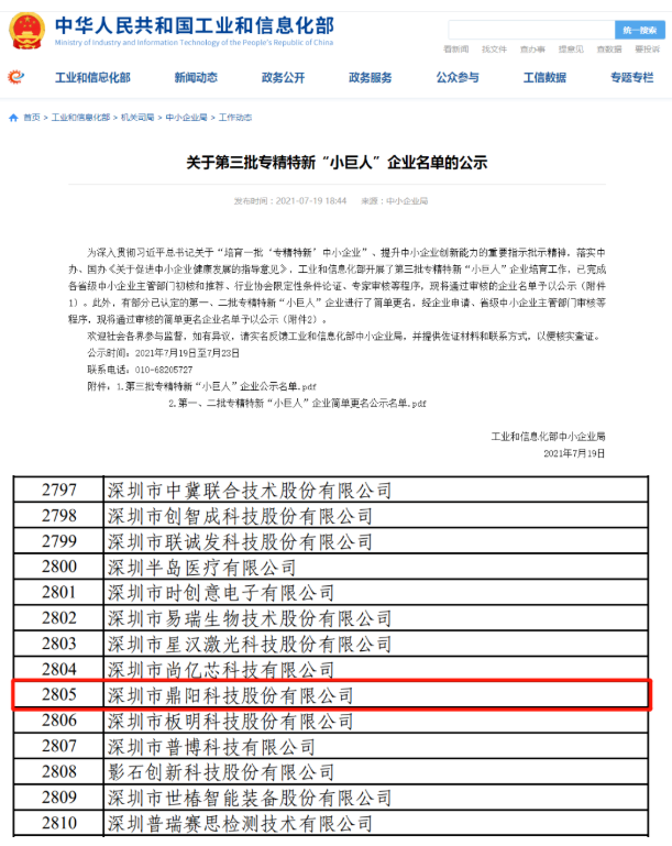2021年7月19日,國家工信部公示了第三批專精特新“小巨人”企業(yè)名單,深圳市鼎陽科技股份有限公司成功入選。此次入選標(biāo)志著鼎陽科技在前沿技術(shù)先進(jìn)性、業(yè)務(wù)擴(kuò)張規(guī)模性以及發(fā)展質(zhì)量示范性等多方面獲得相關(guān)部門的認(rèn)可與肯定。