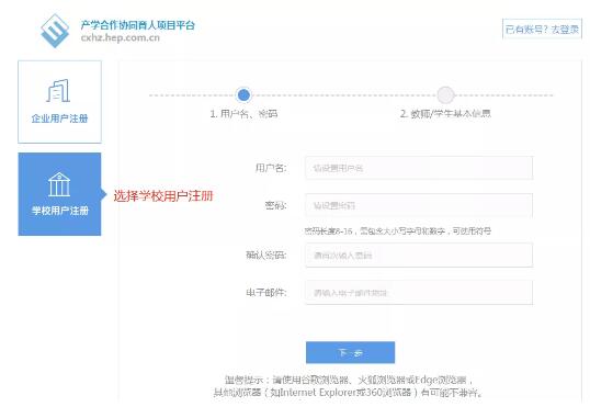 首次登錄需要注冊(cè)信息。選擇學(xué)校用戶注冊(cè),根據(jù)提示設(shè)置用戶名、密碼。完善教師、學(xué)生信息。