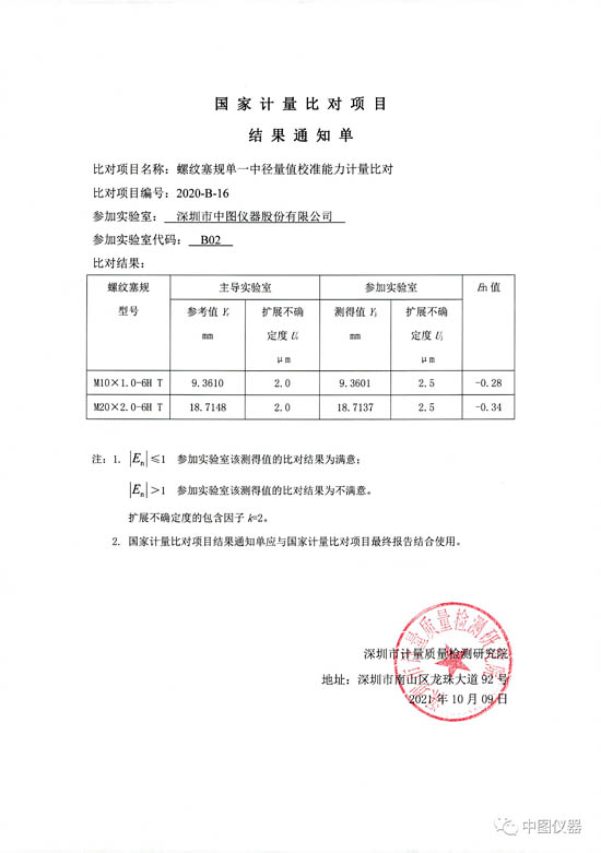 近日,由國家市場監(jiān)督管理總局立項,國家高新技術(shù)計量站/深圳市計量質(zhì)量檢測研究院主導(dǎo)的國家計量比對項目“螺紋塞規(guī)單一中徑量值校準(zhǔn)能力計量比對”(項目編號:2020-B-16)公布結(jié)果,多家參與比對單位取得滿意成果。